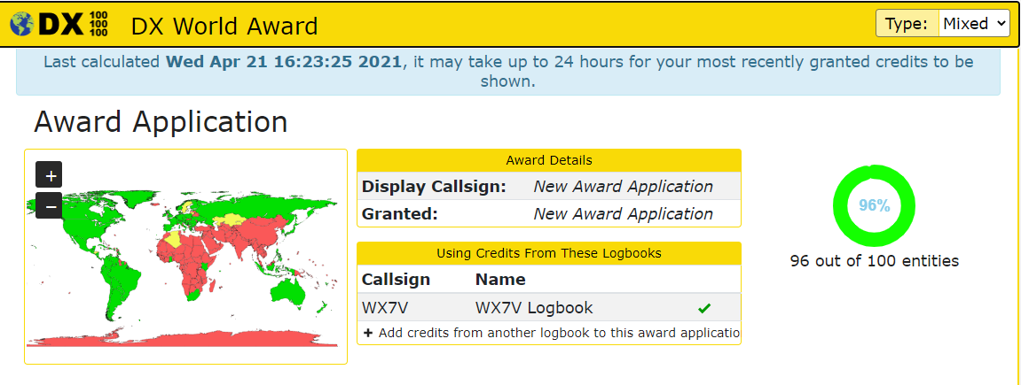 Update: As of April 29th, I have finally confirmed 100 countries on QRZ, and have 97 DXCC confirmed on LoTW. I have a few open QSOs still to be processed thru Club Log: Online QRS tool. In the meantime still 3 short of finishing off the ARRL's DXCC award!